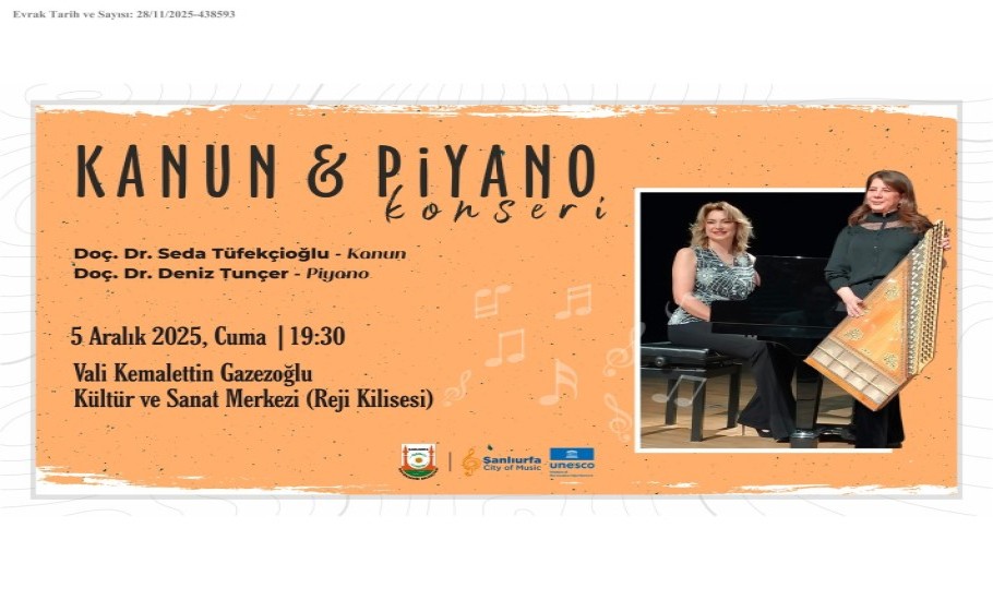 05 Aralık Dünya Kadın Hakları Günü kapsamında, Büyükşehir Belediyemiz ve Harran Üniversitesi Devlet Konservatuvarı işbirliğiyle düzenlenecek Kanun & Piyano Konser-Söyleşi programına tüm halkımız davetlidir.