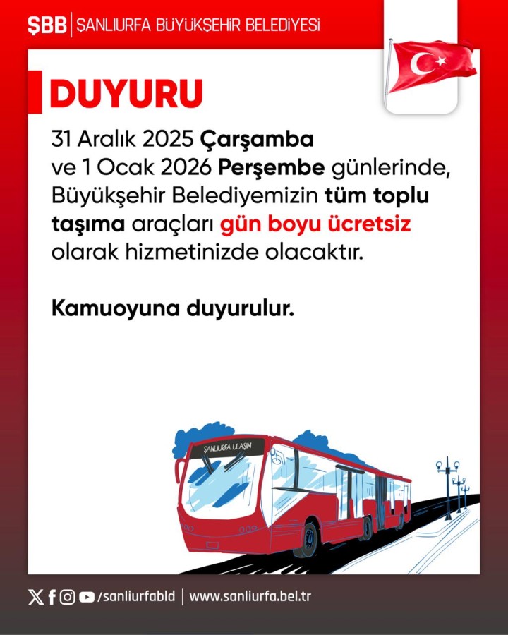 Meteoroloji Genel Müdürlüğü’nün uyarılarının ardından harekete geçen Şanlıurfa Büyükşehir Belediyesi, olası buzlanma ve yoğun trafik riskine karşı ulaşımda aksama yaşanmaması için vatandaşları toplu taşımaya yönlendirmeyi hedefliyor. Bu kapsamda, Şanlıurfa Büyükşehir Belediyesi Ulaşım A.Ş. bünyesinde hizmet veren tüm toplu taşıma araçları, 31 Aralık 2025 Çarşamba ve 01 Ocak 2026 Perşembe günlerinde ücretsiz olarak hizmet verecek.