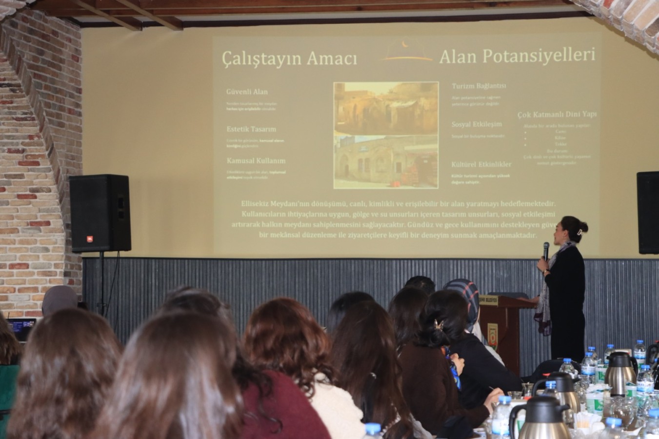 Şanlıurfa Büyükşehir Belediyesi Proje Danışmanı Şeyda Kutluoğlu tarafından öğrencilere ve öğretim görevlilerine, bölgenin tarihi yapısı, mimari özellikleri ve kentsel dokusu hakkında kapsamlı bir sunum yapıldı.