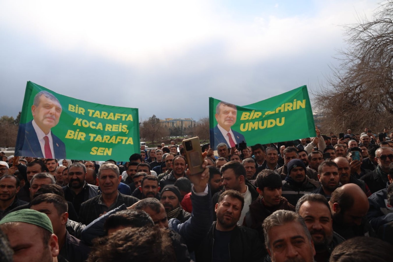 Hizmet-İŞ Sendikası önünde toplanan binlerce işçi ‘’En büyük başkan bizim başkan, Başkan nerede biz oradayız, ne karagül ne kırmızıgül tek sevdamız Beyazgül, sloganları atarak Başkan Beyazgül’e sevgi selinde bulundu.