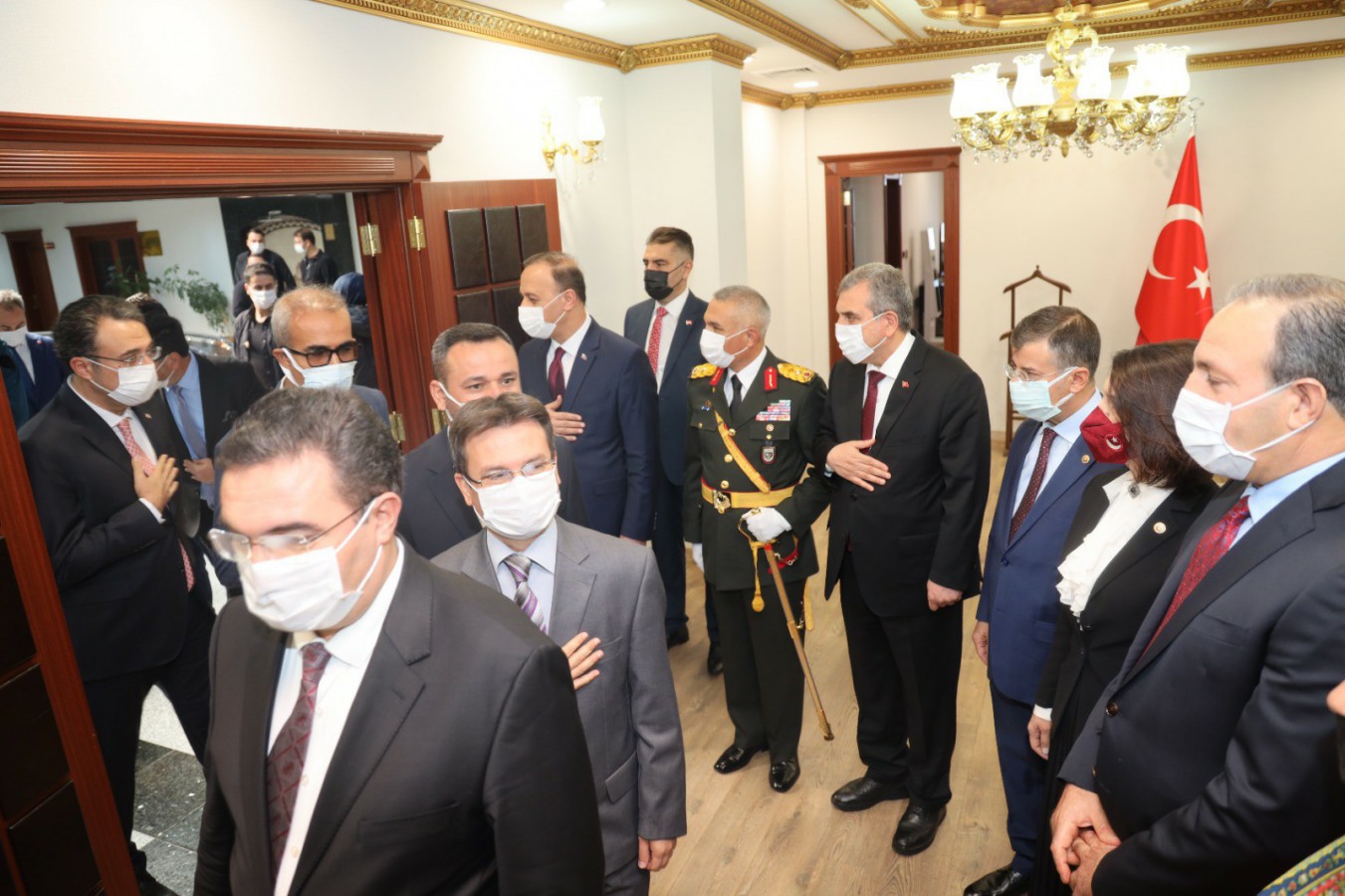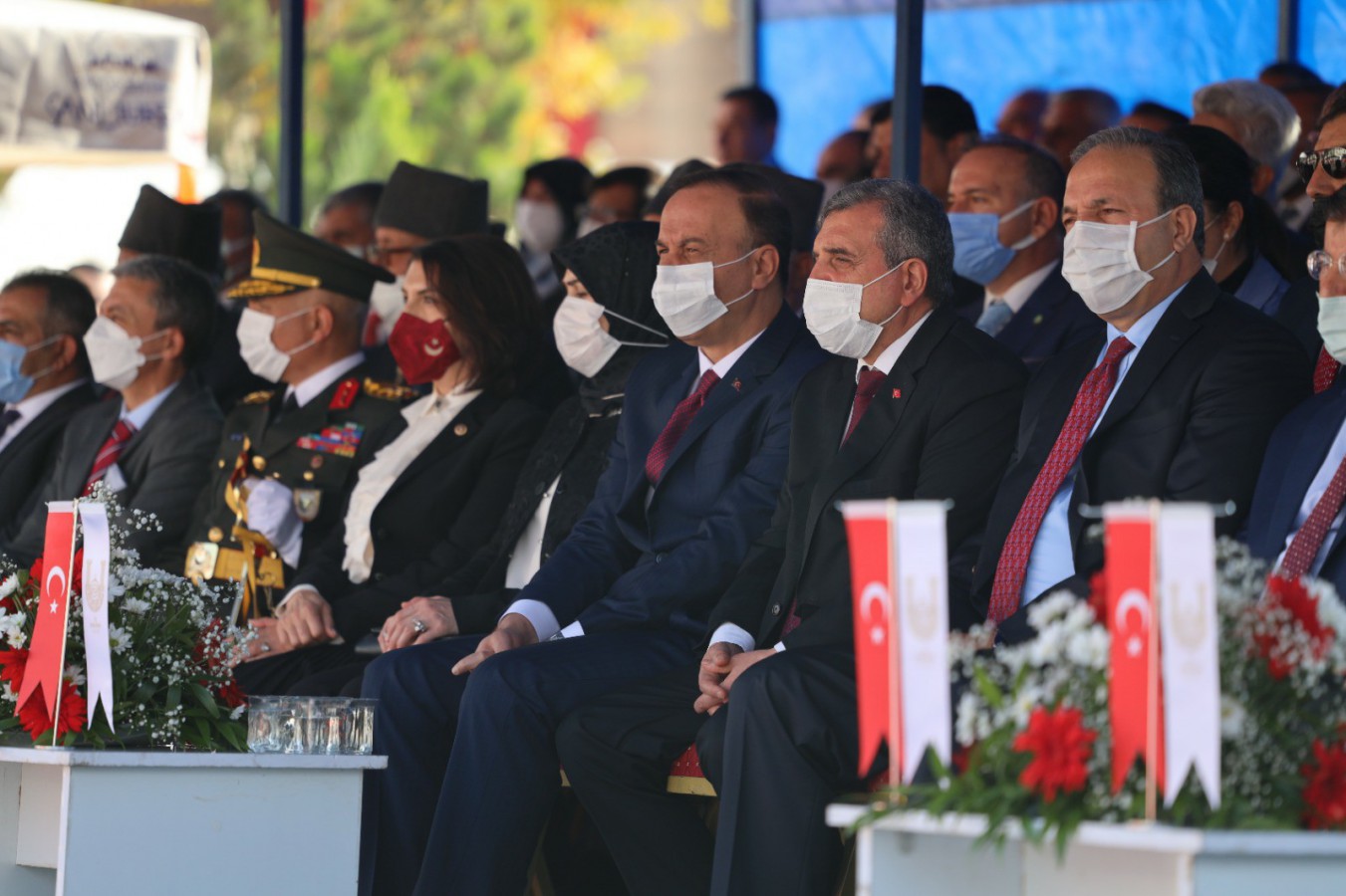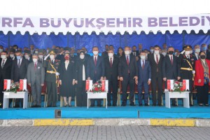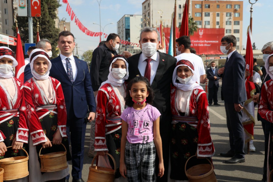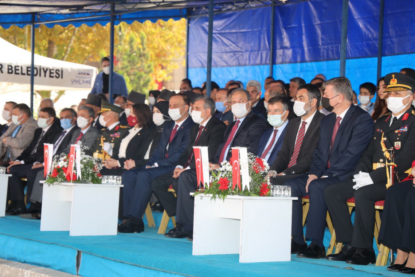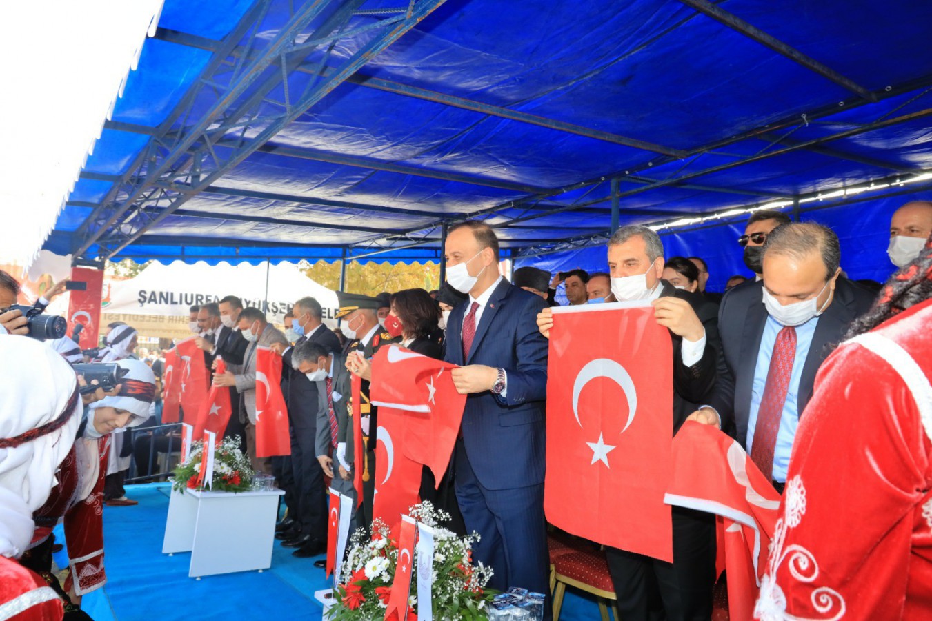 Tebriklerin ardından protokol üyeleri Cumhuriyet Caddesinde düzenlenen törene katıldı. Koronavirüs salgını nedeniyle katılımın kısıtlı tutulduğu törene; Vali Abdullah Erin ve eşi Gülhan Erin, Şanlıurfa Milletvekilleri Zemzem Gülender Açanal, Halil Özcan ve Mehmet Ali Cevheri, Garnizon Komutanı Tuğgeneral Oktay Ağbuga, Şanlıurfa Büyükşehir Belediye Başkanı Zeynel Abidin Beyazgül, Cumhuriyet Başsavcısı Önder Yeniçeri, siyasi parti ve sivil toplum kuruluşları temsilcileri, protokol üyeleri ile öğrenciler katıldı.