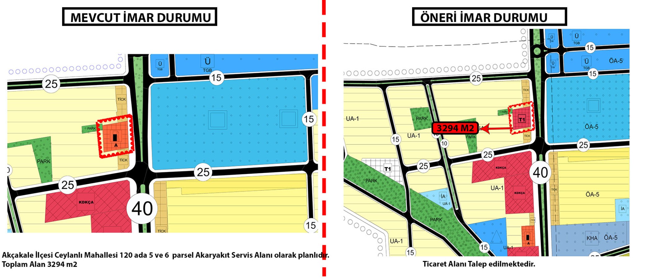 İlimiz Akçakale İlçesi Ceylanlı Mahallesi 120 Ada 5 ve 6 nolu Parseller üzerinde yürürlükteki Nazım İmar Planında "Akaryakıt ve Servis İstasyonu Alanı" olarak planlı alanın "Ticaret Alanı" olarak düzenlenmesine yönelik 1/5000 ölçekli Nazım İmar Planı Değişikliği teklifi Büyükşehir Belediye Meclisinin 12.11.2025 tarih ve 397 sayılı kararı onaylanmıştır.