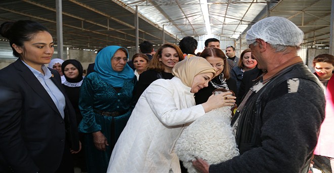 Tülmen Kırsal Kalkınma Kooperatifindeki kadınlarla bir süre toplantı yapan Emine Erdoğan, daha sonra kooperatif bünyesinde yetiştirilen kuzuların olduğu bölümü gezdi.